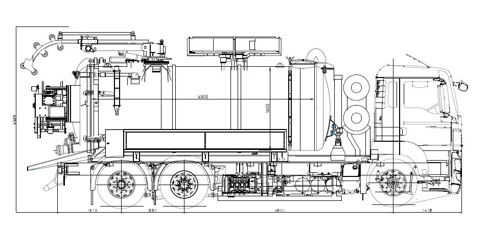 Общий объем бака - 13 000 л .; Отделение чистой воды - 5000 л., Отсек шлама - 8000 л .; Цистерна изготовлена из углеродистой стали EN10025 - S355 - 6 мм., Цилиндрической формы. Передняя, задняя и торцевая стороны изготавливаются из углеродистой стали EN10025 - S355 диаметром - 8 мм., В форме выпячивание в соответствии с DIN 28011 .; Задние двери резервуара открываются полностью. Тип открывания - верхний шарнирный и вертикальный по 2 шт. гидроцилиндров. Задние двери крепятся к баку с помощью 4-х гидравлических замков;
